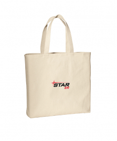 10 Oz., 100% cotton twill with cotton web handles. Approx. 588 cubic inches. Complies with Prop 65. 14" W x 14" H x 3" D